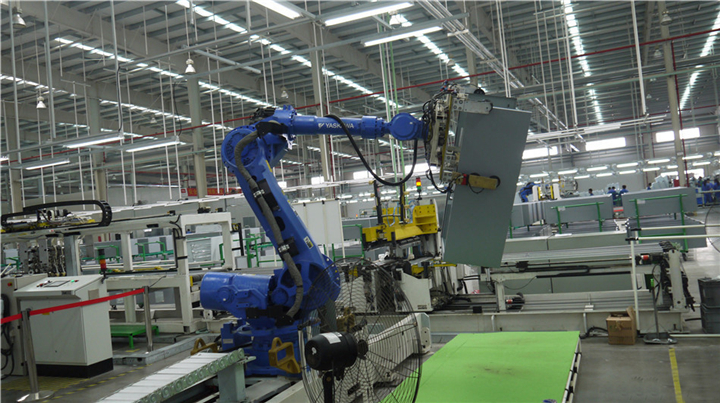 3、壓縮機(jī)自動化組裝。冰箱發(fā)泡后豎身45度、由機(jī)械手固定安裝壓縮機(jī)的工裝設(shè)備,目前已投入實際應(yīng)用。機(jī)器人識別、搬取、固定壓縮機(jī)的裝備技術(shù),改變了原先操作工身兼搬運工、甚至焊接工的情況,明顯降低了現(xiàn)場工人的勞動強(qiáng)度,成為冰箱生產(chǎn)自動化的重要環(huán)節(jié)之一。
