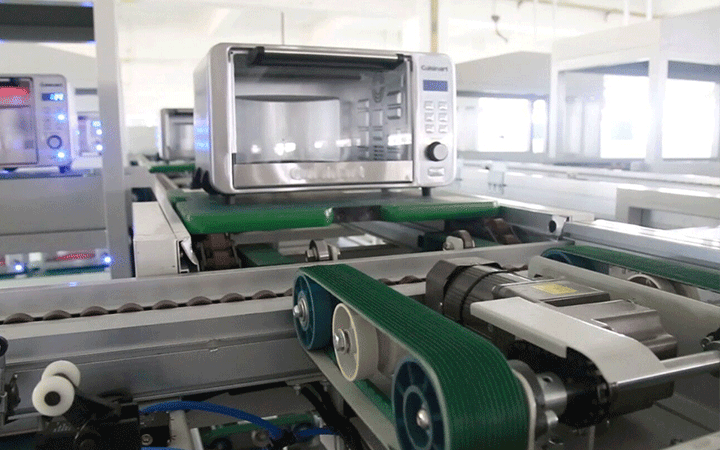 主要由鏈板輸送線組成,鏈板輸送機的輸送面平坦光滑,摩擦力小,可以游刃有余地輸送烤箱配件并進行組裝。