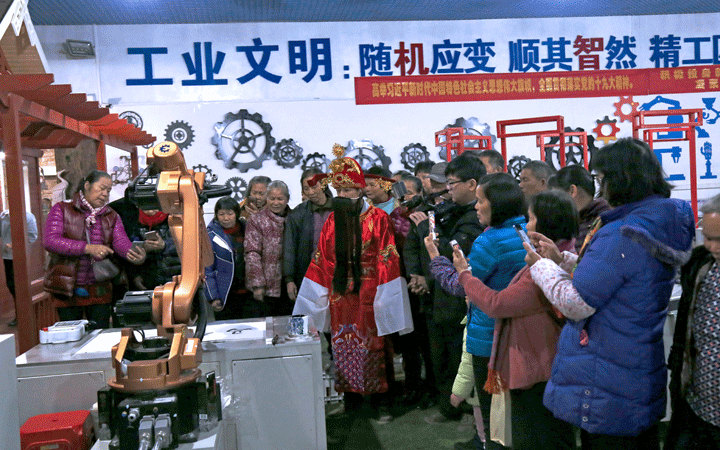 活動現場,匯興智造黨支部、工會委員會、團工委等工作人員裝扮成財神為老人送上新年利是,陪伴老人一同參觀匯興智造工業(yè)4.0智能裝備體驗館,體驗智能制造“隨機應變”“順其智然”改變傳統(tǒng)生產的魅力;觀看由匯興智造員工自編自演的京劇舞蹈廠歌等文藝節(jié)目,感受匯興智造“用情做人、用心做事”,“敬天愛人,孝道為先”的文化力量。