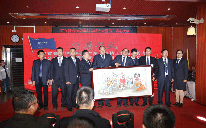 晚會現(xiàn)場,匯興智造董事會、監(jiān)事會成員登臺舉行宣誓儀式,為2018沖鋒表決心、擂戰(zhàn)鼓,確保公司在2020年前實現(xiàn)效率倍增、業(yè)績倍增、效益倍增,成功登陸創(chuàng)業(yè)板。儀式結(jié)束后,宣誓成員們圍繞在梁培浩教授贈送的畫作《大吉大利》周圍,借用畫上8只憨態(tài)可掬的小狗送出“旺狗賀歲、歡樂祥瑞”的祝福。8,既代表2018,也代表“發(fā)”,祝福匯興智造在2018大發(fā)展,創(chuàng)新高。