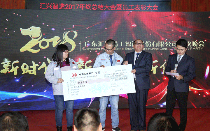 2017年,匯興智造設(shè)立了愛心慈善基金會,為家庭生活異常困難的員工及其家屬奉獻(xiàn)愛心。在晚會現(xiàn)場,家庭遇到極大困難的五名員工接受了愛心捐贈。只要人人都獻(xiàn)出一點愛,世界將變成美好的人間。在場的所有人無不被這一善舉感動拭淚。