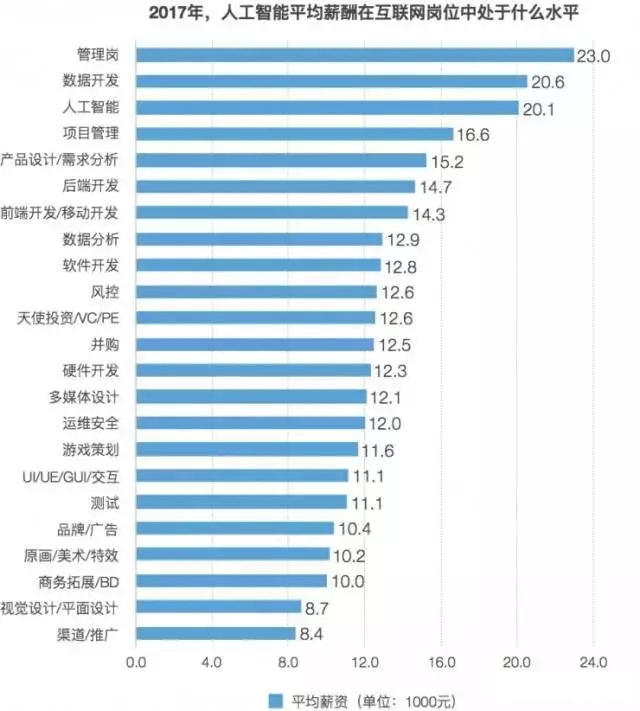 數(shù)據(jù)顯示,管理崗在各崗位中薪酬最高,平均達到 23k,數(shù)據(jù)開發(fā)和人工智能緊隨其后,都在 20k 以上。