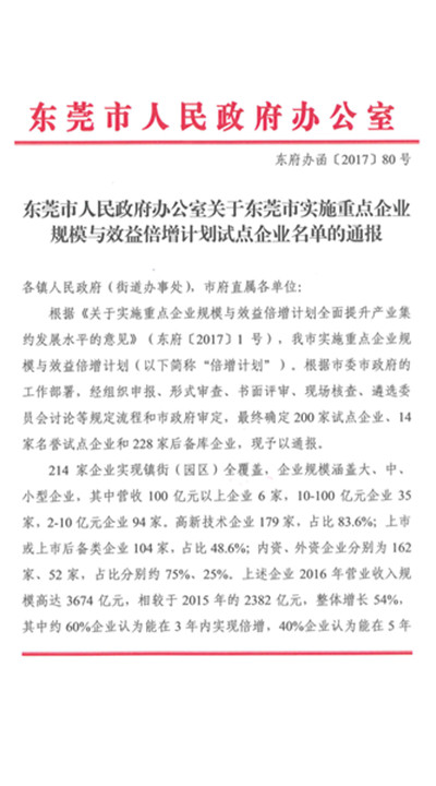 根據(jù)《關(guān)于實(shí)施重點(diǎn)企業(yè)規(guī)模與效益倍增計劃 全面提升產(chǎn)業(yè)集約發(fā)展水平的意見》(東府〔2017〕1號),以及《關(guān)于東莞市實(shí)施重點(diǎn)企業(yè)規(guī)模與效益倍增計劃試點(diǎn)企業(yè)名單的通報》(東府辦函〔2017〕80號),經(jīng)過前期的書面申報、形式審查、書面評審、現(xiàn)場核查、專家評審、材料審計等規(guī)定流程和市政府審定,廣東匯興精工智造股份有限公司(股票代碼:839258)憑借17年來在智能裝備領(lǐng)域的核心科技以及高成長性,成功入選為東莞市實(shí)施重點(diǎn)企業(yè)規(guī)模與效益倍增計劃(以下簡稱“倍增計劃”)200家試點(diǎn)企業(yè)之一。