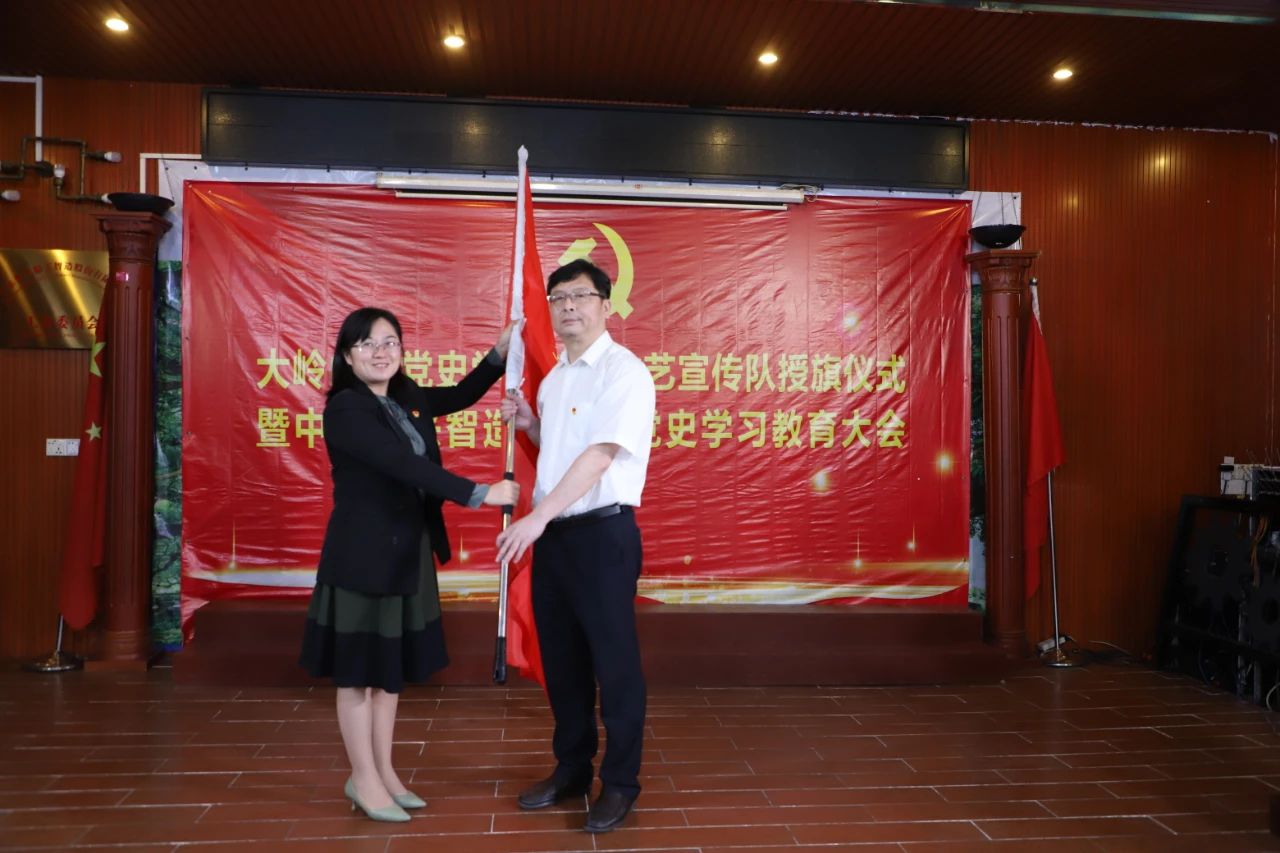 鎮(zhèn)委委員葉淑帆出席并為大嶺山文化服務(wù)中心黨支部書(shū)記楊繼春授“黨史學(xué)習(xí)教育文藝宣傳隊(duì)”隊(duì)旗。鎮(zhèn)宣教文體旅辦、文化服務(wù)中心、黨建工作辦、宣傳文化線代表及匯興智造員工代表約100人參與了活動(dòng)。