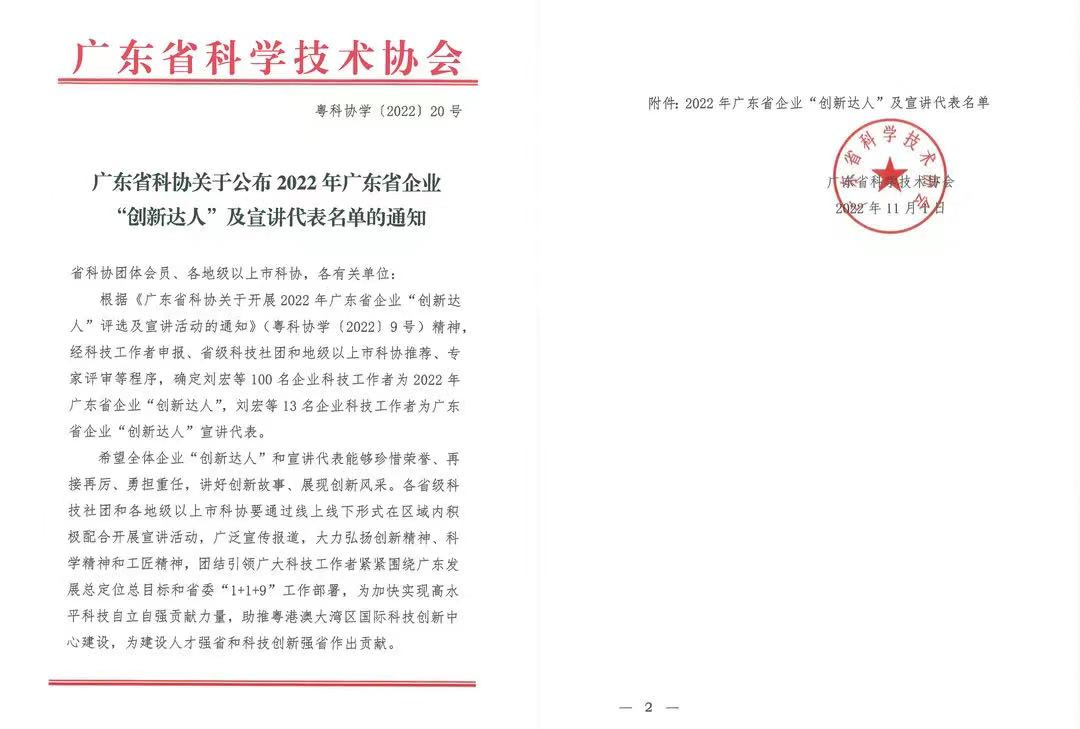 ”講好創(chuàng)新故事 、 展現(xiàn)創(chuàng)新風(fēng)采“2022年11月15日,由廣東省科學(xué)技術(shù)協(xié)會(huì)開展的2022年廣東省企業(yè)“創(chuàng)新達(dá)人”評(píng)選活動(dòng)中,經(jīng)科技工作者申