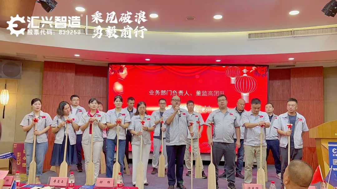 參會(huì)現(xiàn)場(chǎng)董監(jiān)高上臺(tái)在沒(méi)有任何彩排的情況下,進(jìn)行劃龍舟展示,在鐘董的指揮下,整齊劃一的劃動(dòng)船槳。意在把團(tuán)結(jié)拼搏、奮勇向前的龍舟精神轉(zhuǎn)化為推動(dòng)匯興智造高質(zhì)量發(fā)展的動(dòng)力,激勵(lì)大家在干事創(chuàng)業(yè)的賽道上,拼出精彩,拼出未來(lái)。